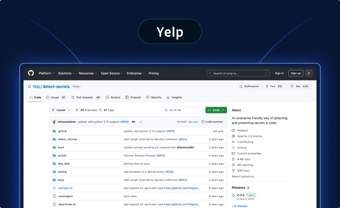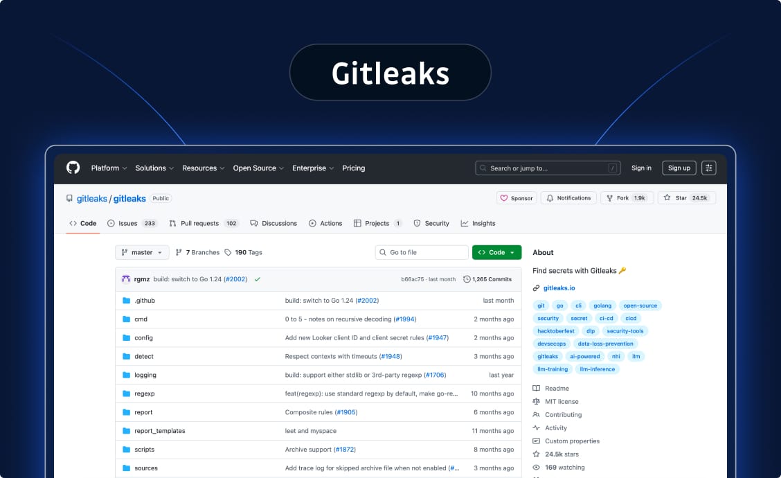 GitGuardian is an enterprise-grade secrets security platform that scans across the entire SDLC: source code, CI/CD pipelines, containers, IaC files, and even public GitHub history, as well as collaboration tools such as Jira or Slack. It's built for organizations that need comprehensive detection combined with governance and remediation features to fix what gets found.
