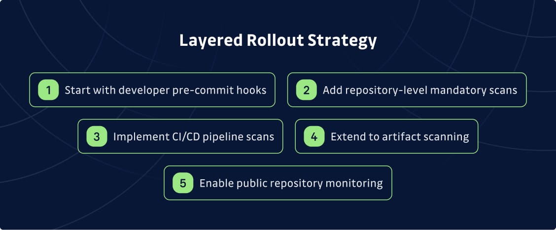 - Start with developer pre-commit hooks using tools like Git-Secrets or Detect Secrets. This catches secrets before they hit your repository and creates immediate feedback for developers.