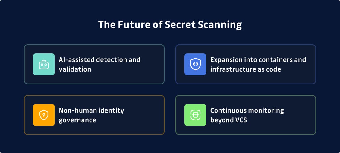 - Expansion into containers and infrastructure as code reflects where secrets actually live. Developers increasingly define infrastructure through code, and every Terraform template or Kubernetes manifest can contain hardcoded credentials. Secret scanning is expanding to meet the reality of modern development.
