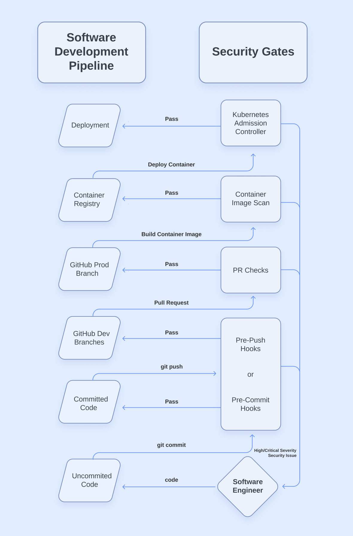 With that out of the way, let’s jump into the different types of security gates that we can set up in our pipeline. Below is the next part of our diagram which shows the interactions between our traditional pipeline and our security gates.