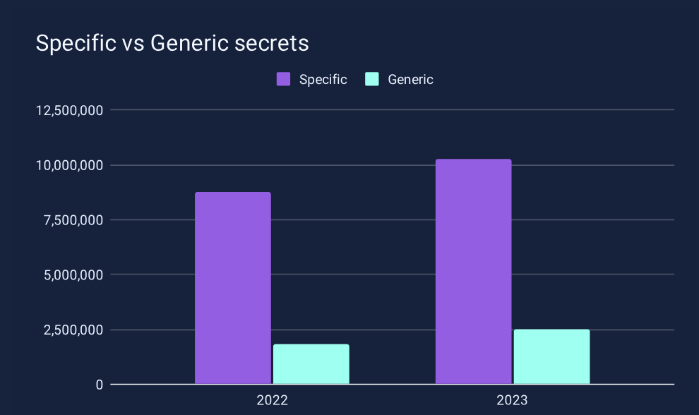 When we dig a little deeper into these numbers, one overwhelming fact springs out: specific secrets detected, the vast majority of which are API keys, outnumber generic secrets detected in our findings by a significant margin. This makes sense when you realize that API keys are used to authenticate specific services, devices, and workloads within our applications and pipelines to enable machine-to-machine communication. This is very much in line with research from CyberArk, machine identities outnumber human identities by a factor of 45 to one. This gap is only going to widen continually as we integrate more and more services in our codebases and with ever-increasing velocity.