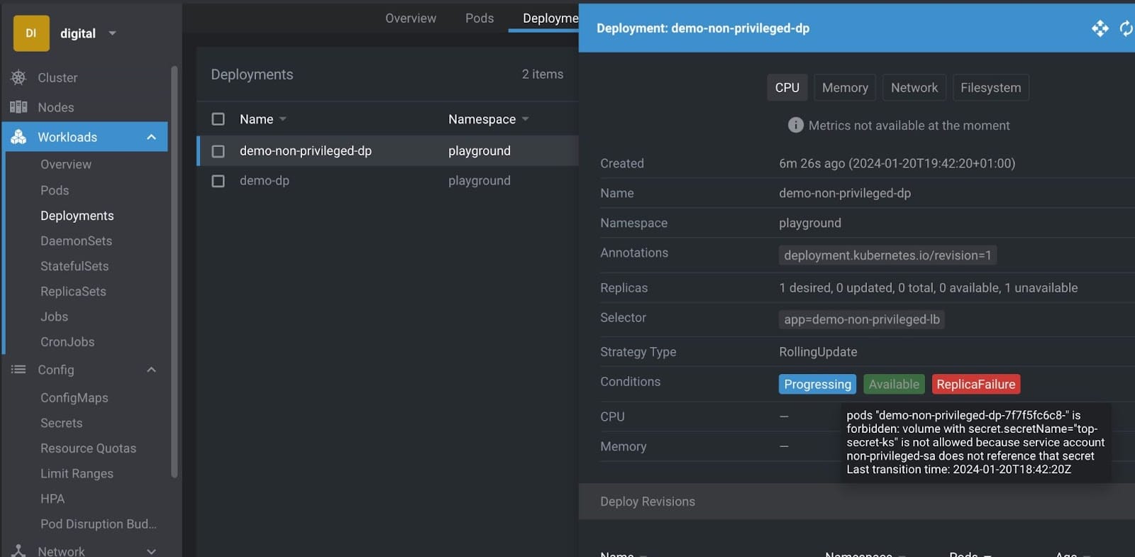 Here is a copy of the previous deployment, only using a non_privileged Service Account: Non-Privileged Deployment. Trying to deploy it would result in an error: