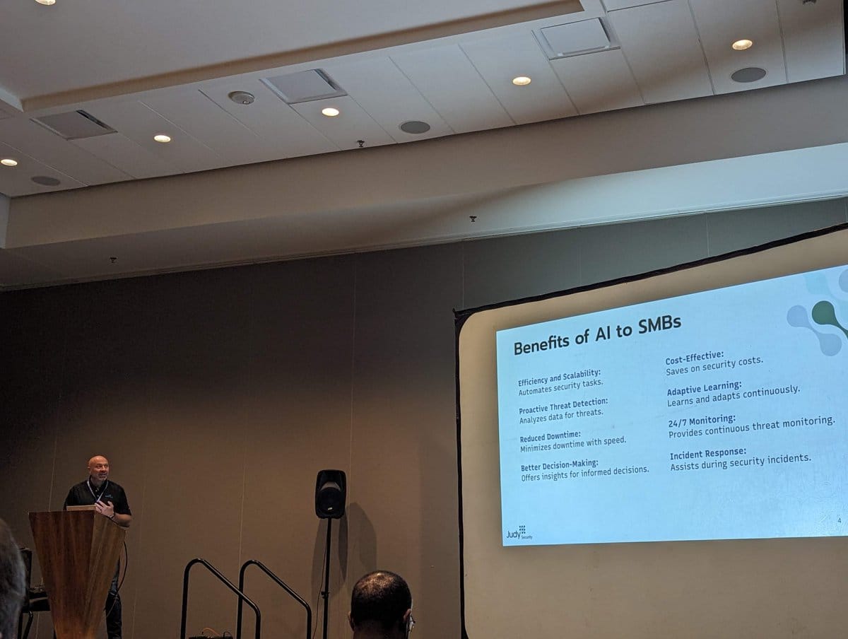 It might be easy to look at the advances being made with AI and assume you need to be a big company to reap the benefits. In his talk, "How will AI change the cybersecurity landscape?" Raffaele Mautone, CEO and founder of Judy Security, explained that small and medium-sized businesses, SMBs, stand to benefit significantly. AI helps in two significant ways: by making it possible to automate and enabling scale like never before.
