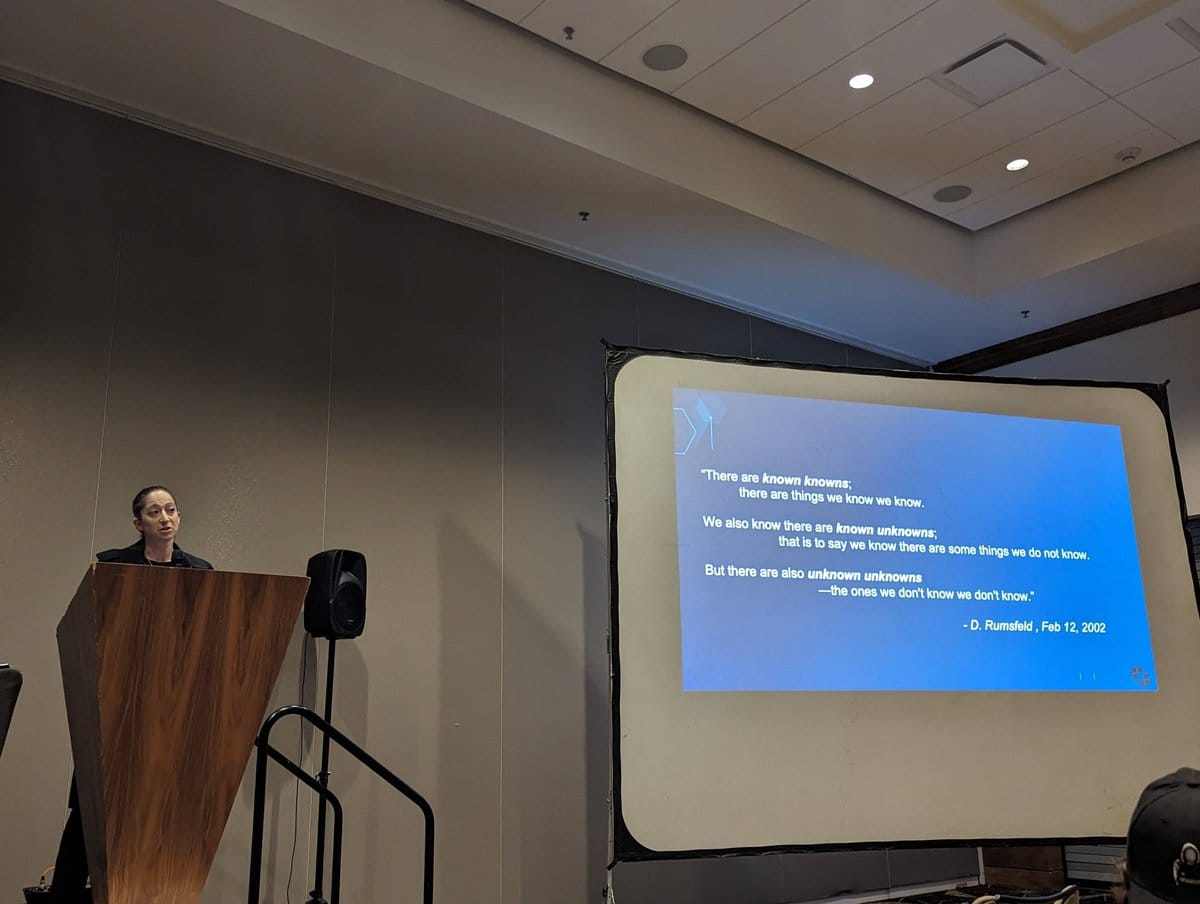 Zero Trust was another recurring topic across sessions. JC Herz Senior Vice President of Software Supply Chain Solutions at Exiger continued the theme in her session "Zero Trust in the Software Supply Chain." She said the world of software supply chains, SSC, and security is very much a war front and she cited what former US Defense Secretary Donald Rumsfeld once famously said, "There are known knowns; there are things we know we know. We also know there are known unknowns; that is to say, we know there are some things we do not know. But there are also unknown unknowns—the ones we don't know we don't know."