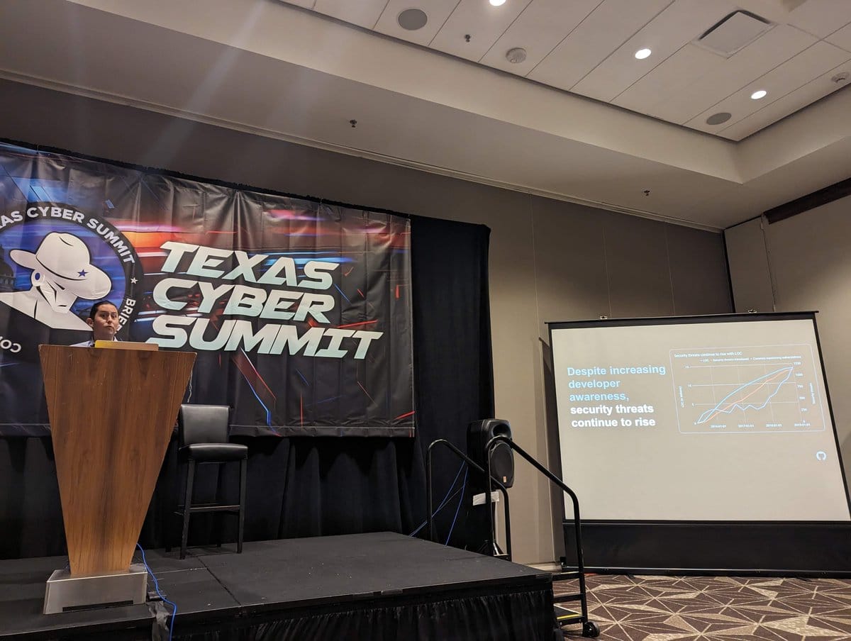 With over 1300 attendees, this year's Texas Cyber Summit brought together a wide variety of folks. Backgrounds ranged from the NSA and CYBERCOM to industry leads like Snyk and GitHub and welcomed students and folks looking to get started in cybersecurity. The goals we all had in common were to learn, share our knowledge, and grow as a community. This year the focus was very well timed, as AI has been at the forefront of so many conversations. I can't wait to see what theme the Texas Cyber Summit community picks for next year and the conversations that happen about it.
