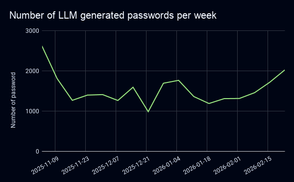 In February 2026, researchers at Irregular published a detailed post about LLM-generated passwords. This post goes into detail on how passwords generated by LLMs follow notable patterns and are generally highly predictable.