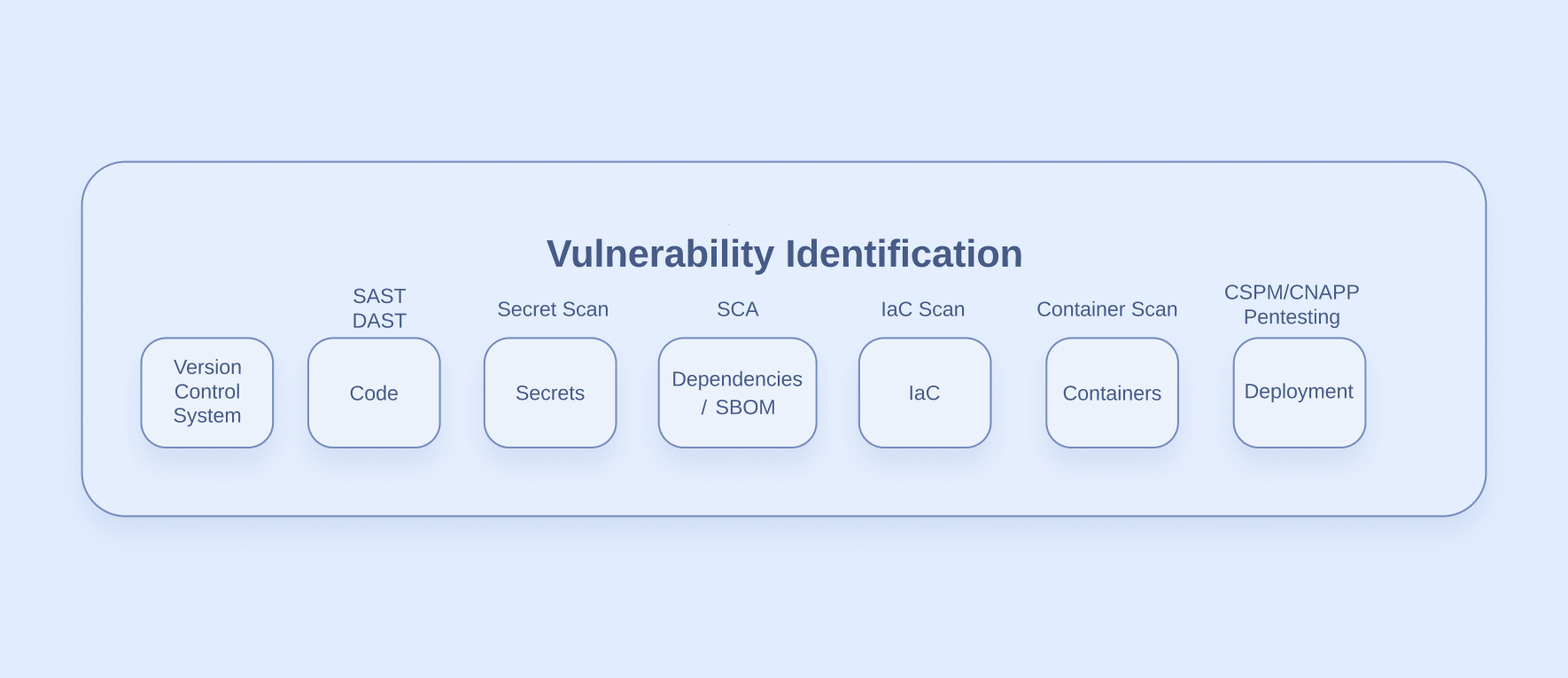 The first stage of our diagram is a list of places in the software development lifecycle (SDLC) where vulnerabilities or misconfigurations can arise, as well as the types of vulnerability scanning tools that can identify security issues in these areas. Here’s a quick rundown of each area: