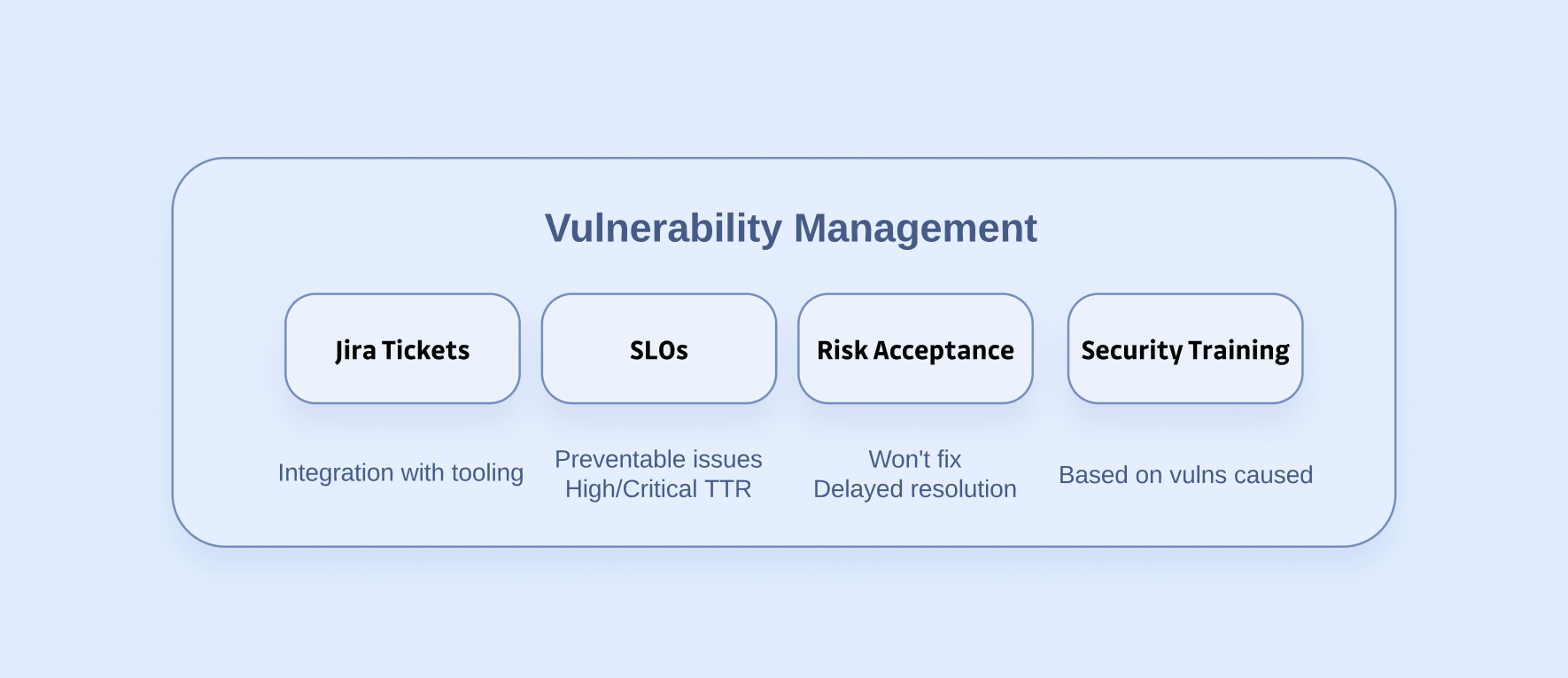 The last piece of vulnerability management is an often-overlooked area: security training for non-security personnel. Insights from our observability stage can highlight which types of vulnerabilities a developer or team is struggling with. These insights help security teams and leaders identify training needs.